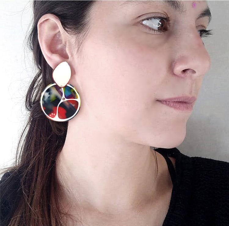 Hechos a mano desde la reutilización de bolsas plásticas y otros materiales reciclables, éstos aros de la línea abstracta, no pasarán desapercibidos...