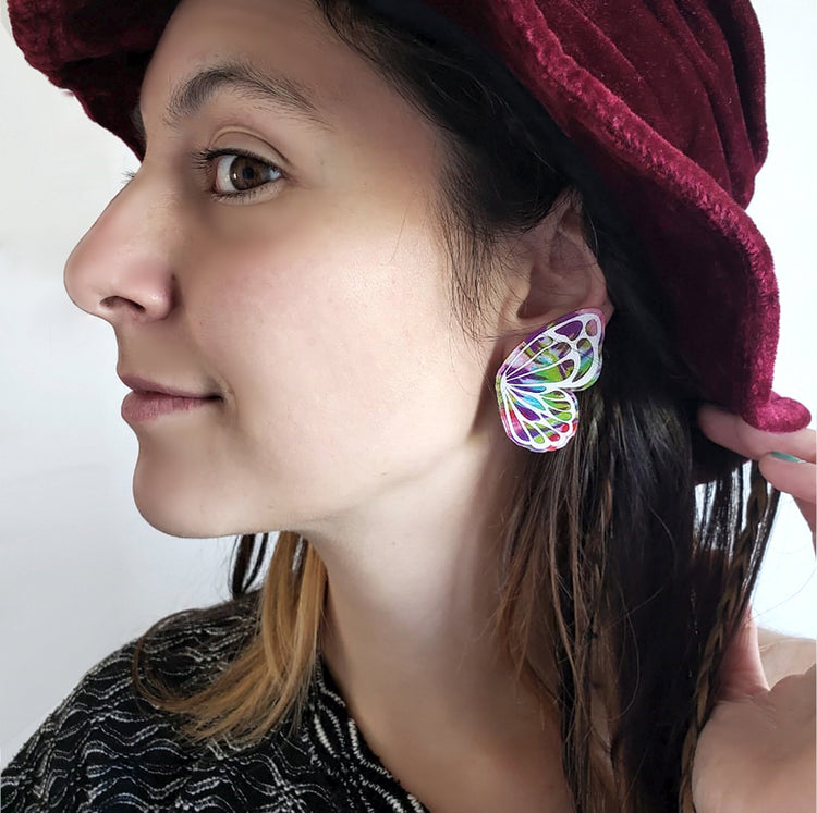 Hechas a mano desde la reutilización de bolsas plásticas y otros materiales reciclables, éstos aros de mariposa, te harán volar ...vástago de plata 9/50.